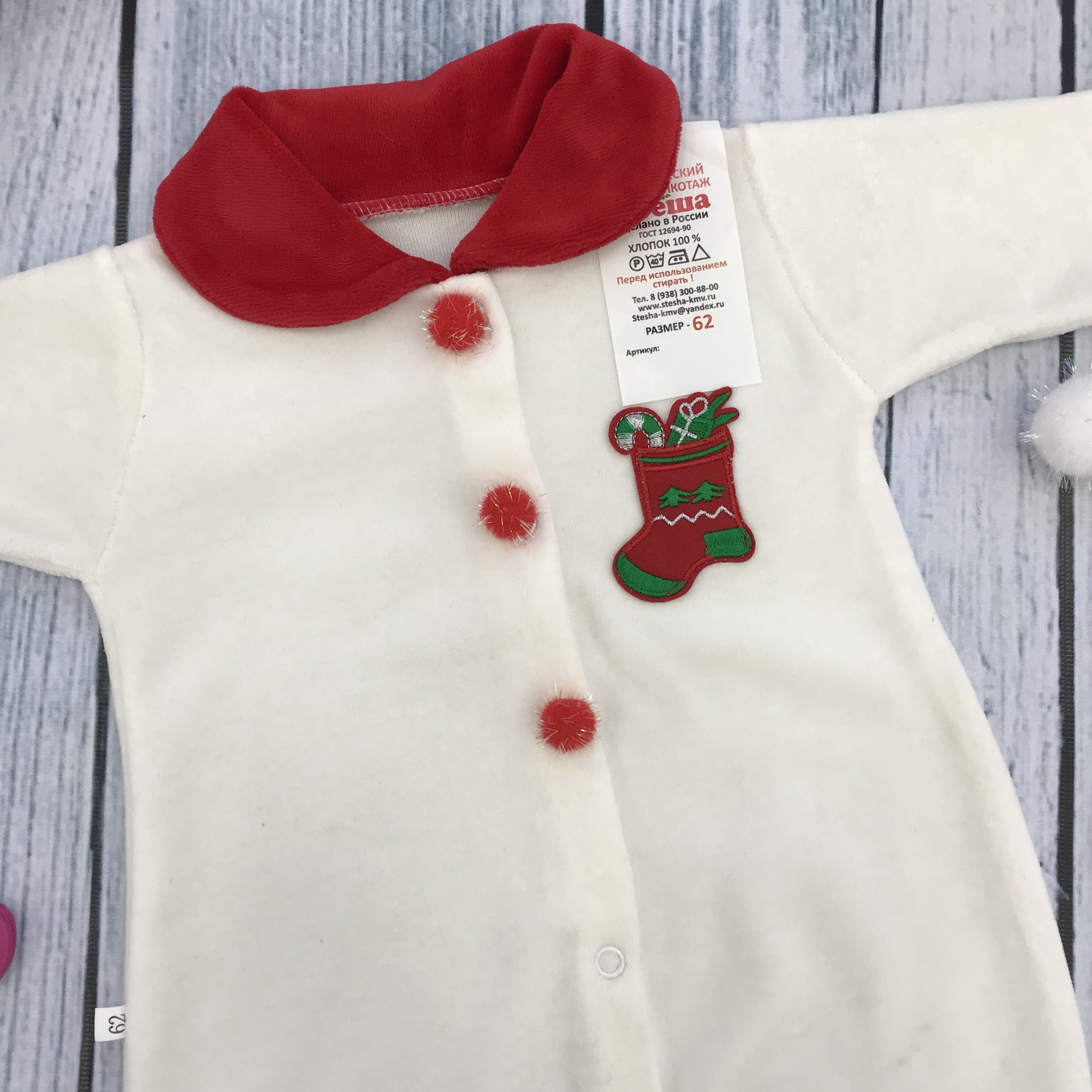 Теги: Купить оптом новогодний комбинезон от производителя. 244. Комбинезон Санта, хлопок 80% велюр 20% ПЭ, молочный 56,62,68 цена,отзывы официальный сайт "Стеша Тула"